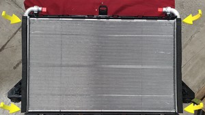 将散热器进口和出口软管放在散热器的顶部右侧,然后安装将软管连接到散热器的弹簧夹(2 个)。