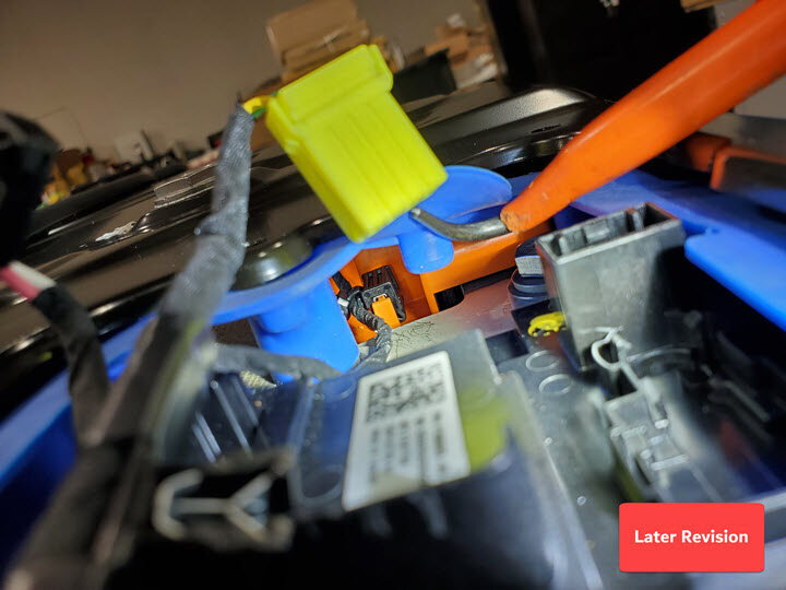 - 将电气线束接回高压电池正极触点开关,紧固将两者固定在一起的边缘夹。