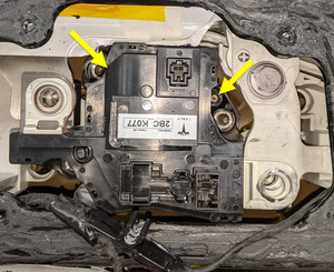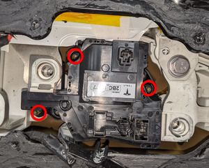 - 将高压电池正极触点开关从安装螺柱(2 个)和导销(2 个)上拆下,并将其从高压电池中取出。