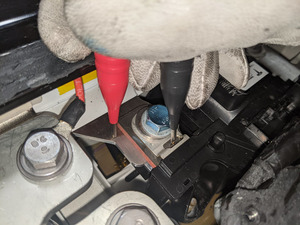 安装新的螺栓,将高压电池正极触点开关固定到两个按钮式触点开关后端子,紧固后,使用油性记号笔标记螺栓。