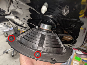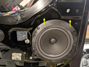 - 松开将左后门扬声器连接到左后门的锁片(2 个),断开电气连接器,然后从车门上拆下扬声器。