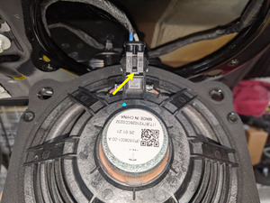- 将左后门扬声器放在左后门上,连接电气连接器,然后固定将扬声器连接到门上的锁片(2 个)。