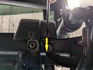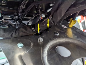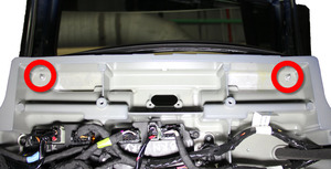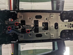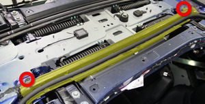 - 将中央脊柱封闭板定位到车内,然后固定将线束固定到中央脊柱封闭板前部的卡子(2 个)。
