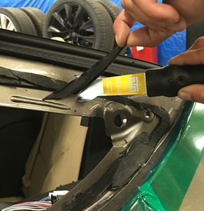 - 使用带侧翼的刮刀(1080601-00-A 垫片刮刀 )和异丙醇 (IPA) 清洁左后围板上多余的聚氨酯。