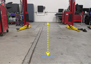 将车辆停放在垂直于墙壁的水平面上,并将前部饰板与地面上的胶带对齐。