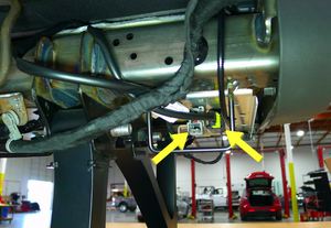 - 断开左侧第二排座垫电气连接器(4 个),然后松开用于将黑色连接器(2 个)固定到座椅框架上的卡子(2 个)。