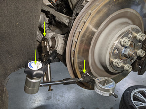 从后制动盘端部向内测量 45 毫米并对齐数字指示器。按下指示杆和零位测量。