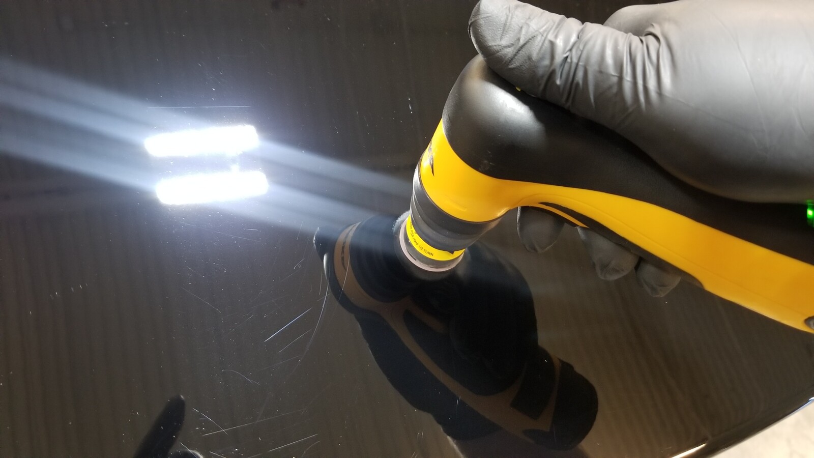 - 保持抛光垫与车身板件齐平,启动抛光机 5 秒,对受影响部位进行 1 英尺长的左右滑扫。