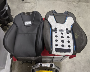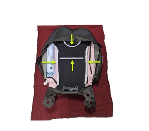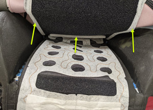 - 将驾驶座靠背饰板放在驾驶座靠背泡沫上,对准 Velcro 扣带(4 条),然后将气囊袋放入靠背泡沫的左侧。