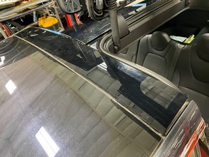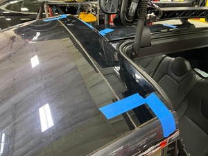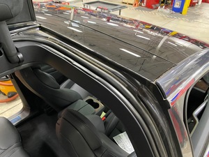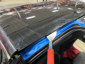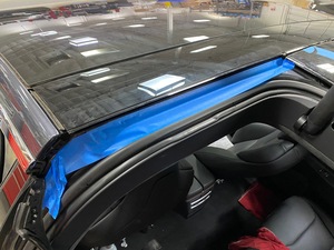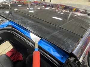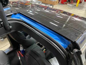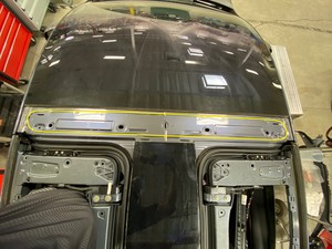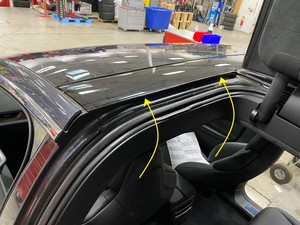 - 在车顶饰板总成上部粘贴胶带,将其暂时固定柱。按照聚氨酯制造商的说明操作,确保聚氨酯正确风干。