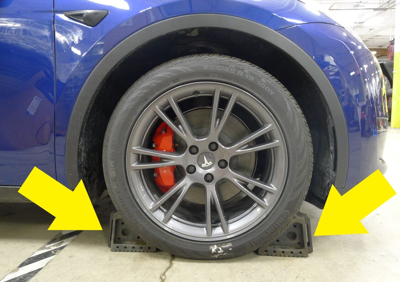 举升车辆时,在对角方向车轮下放置止轮块,例如:
