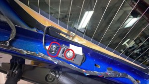 将天线接地噪音过滤器放入掀背尾门,然后安装螺栓并固定将噪音过滤器连接到掀背尾门的固定夹。