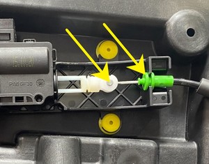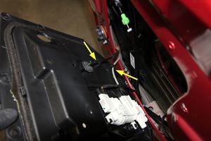 - 从左侧前车门封闭板背面的卡子上松开闩锁拉索(2 个)。