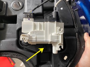 - 松开锁片,然后从左侧前车门封闭板上拆下卷带电机。