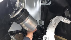 拆下用于固定左前空气弹簧模块的螺母,然后拆下该模块