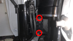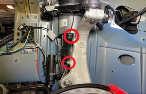 注2 个螺栓,10 mm,8 Nm,1 个固定销。将储液罐连同支架一起旋转安装到左侧固定悬架传感器 (FST) 盖上