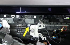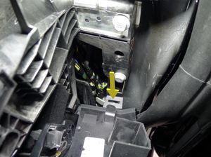 1 个连接器,2 个固定销,向内侧旋转支柱以够到连接器;向上松开固定销并从仪表板分总成取出