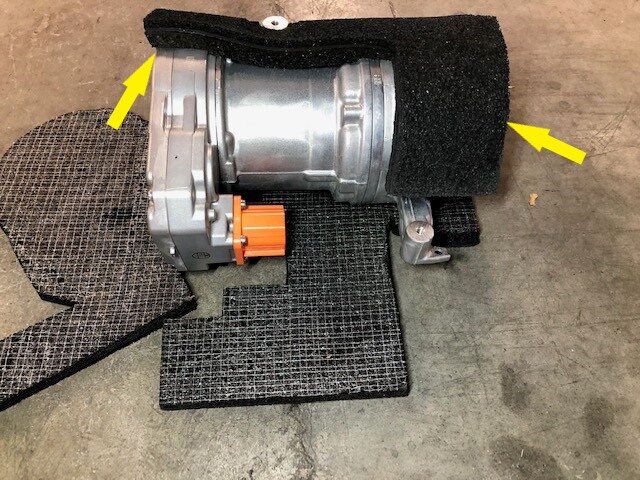 Remove the NVH acoustic cover from the new AC compressor, and then remove any remaining adhesive material from the compressor.