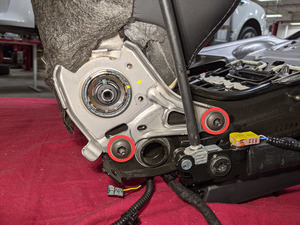 在助手的帮助下,拆下并丢掉用于将副驾位座椅靠背固定到座椅框架上的螺栓(4 个),然后将靠背从座椅上拆下。