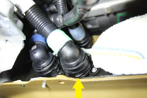 松开将高压电池至三通阀软管连接到高压电池的软管夹,从高压电池上拆下软管,然后在软管和高压电池上安装冷却液软管塞。