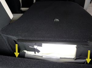 - 从底部开始,小心地将第二排 40 座椅孔罩撬离座椅靠背,以松开卡子(2 个),然后从座椅上拆下孔罩。