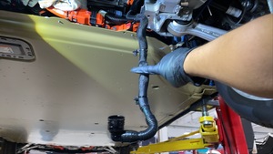 将前驱动单元 (FDU) 逆变器至机油冷却器软管安装到车内,并固定软管。