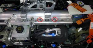 注2 个螺栓,15 mm,31 Nm;建议请助手帮忙,在安装紧固件时,需支撑空调压缩机,小心地朝车尾和支柱塔梁下方安装空调压缩机和空调压缩机支架,将支架安装在冷却液软管和超级歧管线束周围,手动紧固螺栓。
