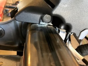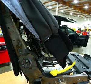 - 将右侧第二排座椅内侧下铰链盖板定位到座椅总成,然后安装将盖固定到座椅总成的推拉式卡子。