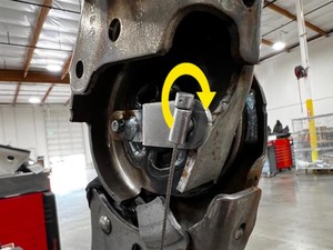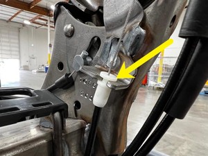 - 将右侧铰链杆旋转 90 度,对齐锁片,然后将靠背倾角调节器执行机构分离拉索拉离铰链杆,以松开靠背倾角调节器执行机构分离拉索。