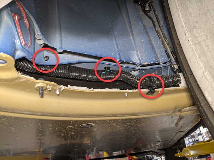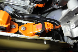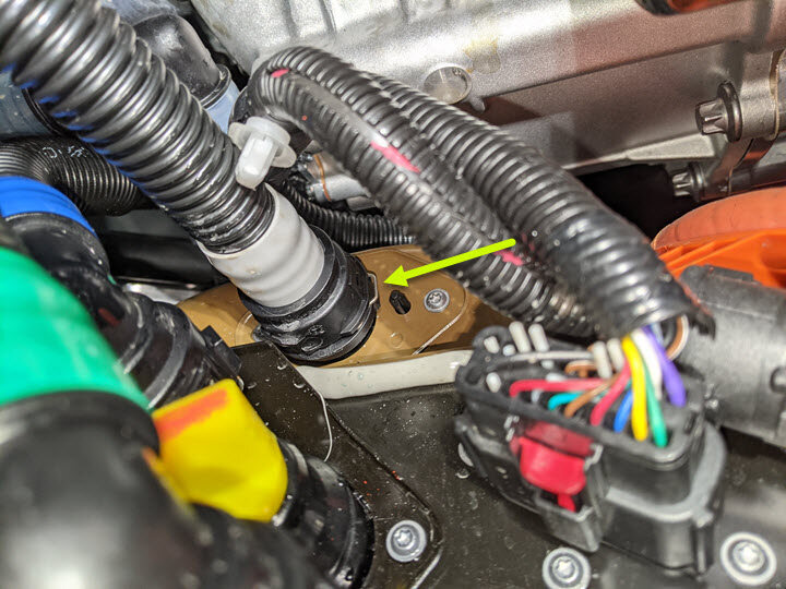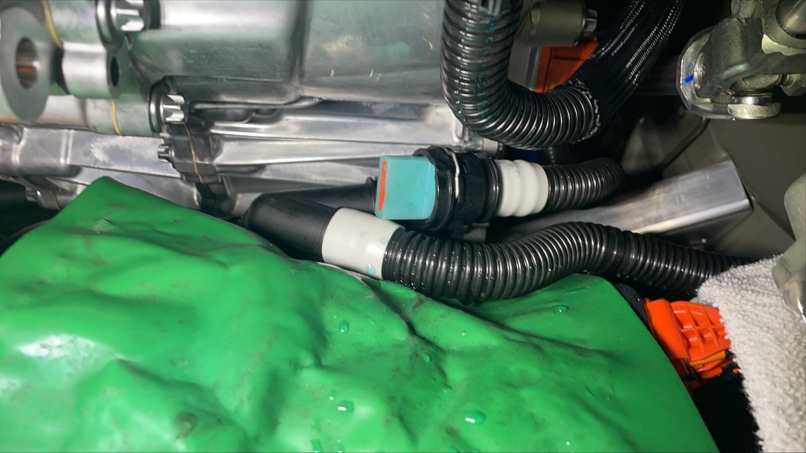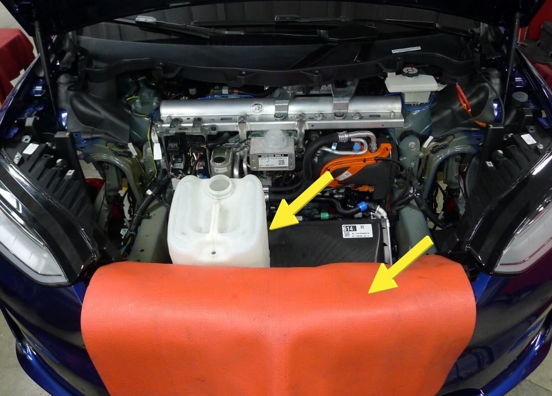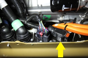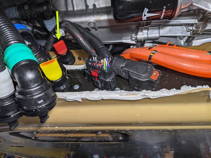 - Plaid vehicles only - Place a foldable funnel and absorbent material over the HV harness connectors and under the power conversion system coolant return hose to direct coolant away from the HV battery.