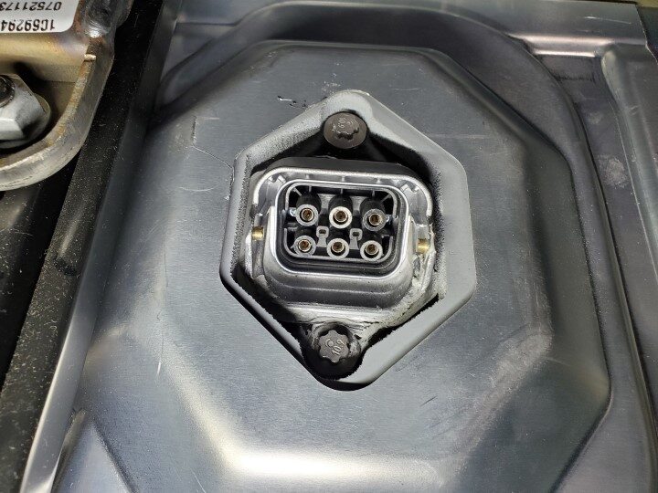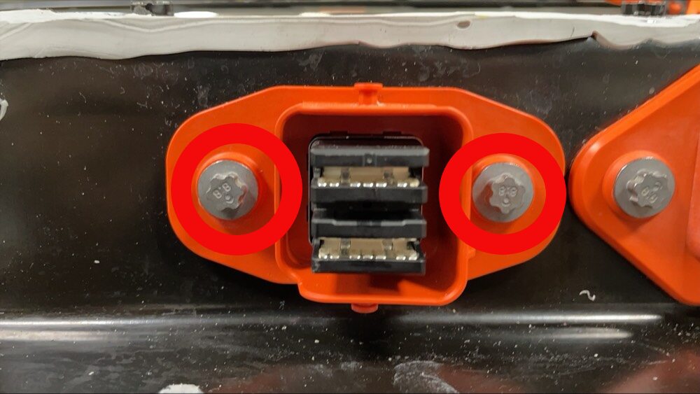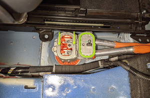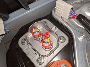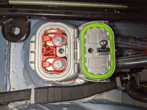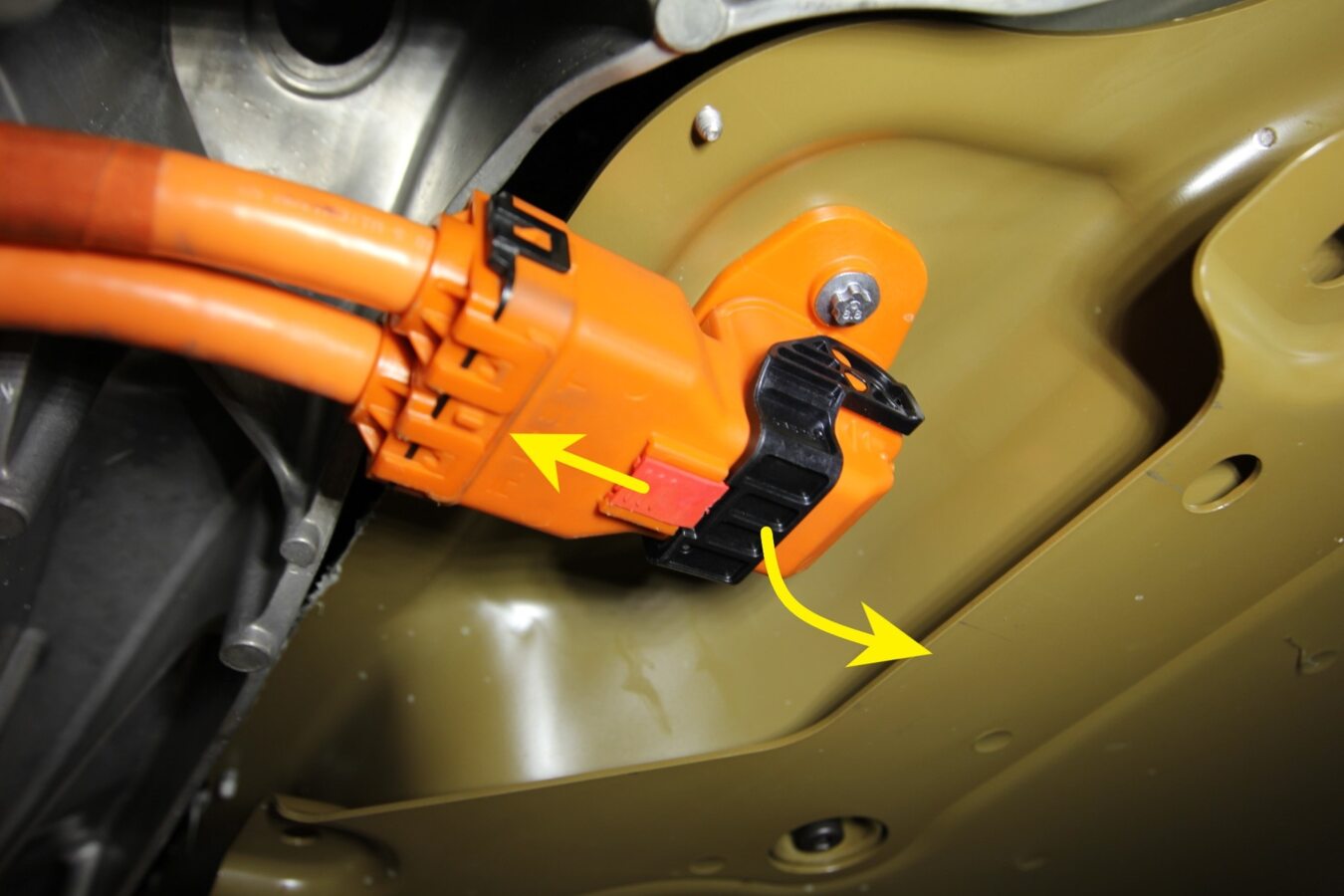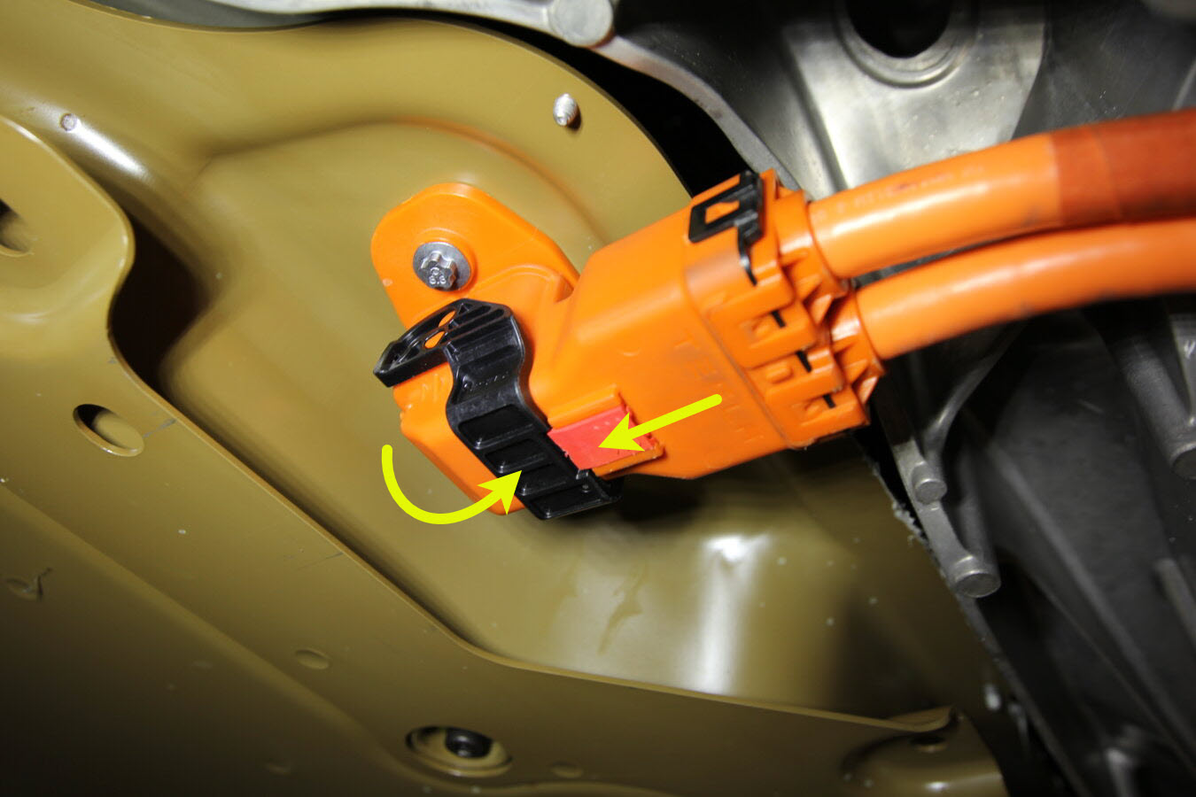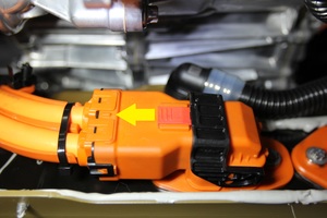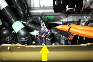 - Pull the red locking tab out, and then disconnect the electrical harness from the HV battery LV connector.