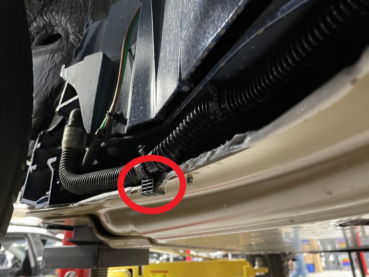- Release the clip and disconnect the power conversion system coolant return to LH sill hose from the LH sill hose, and then immediately plug the fittings.