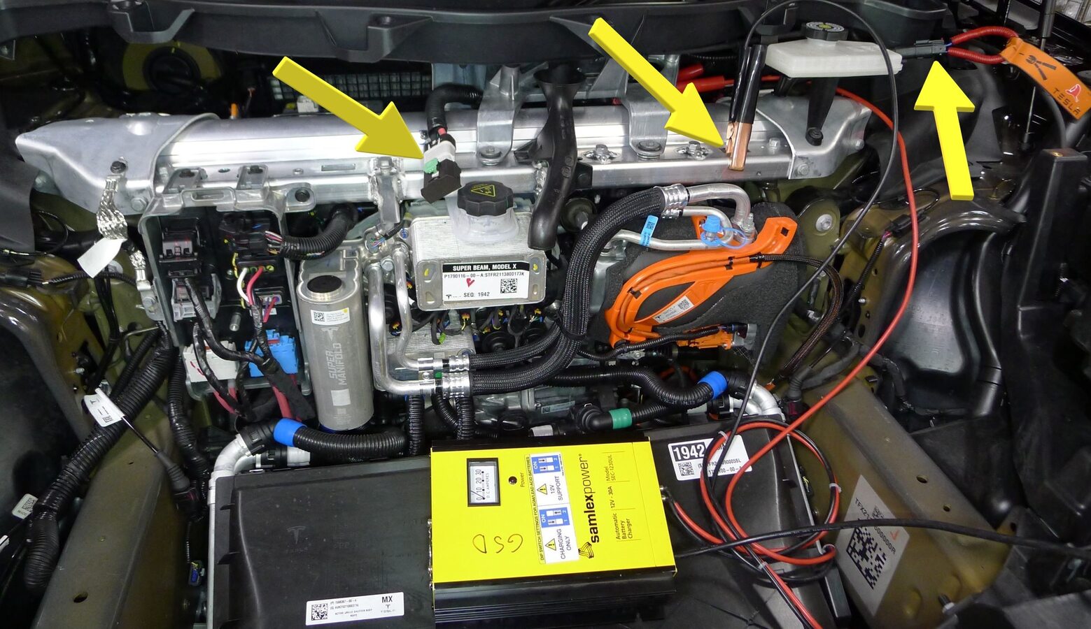 注Release the positive jump post cover behind wiper module. Place a shop towel to prevent shorting jump post to multi system beam. Connect first responder loop then secure 12v maintainer to positive jump post and chassis ground. Vehicle will power on with 0% Low Voltage message at UI.