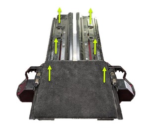 将毡毯滑动到总成后部,然后拆下并丢掉用于将毡毯固定到左侧第二排座椅止动爪支架上的螺栓(4 个)。
