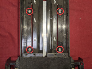 安装新的螺栓(4 个)和旧垫圈,将毡毯固定到左侧第二排座椅止动爪支架上。