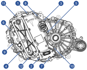 按图示顺序紧固将后驱动单元左侧变流器固定到后驱动单元左侧变速箱的螺栓(12 个)。