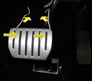安装制动踏板垫:在踩下制动踏板片中心的同时,将制动踏板接合到两侧和底部的三个凹槽中,然后将制动踏板片旋转到位。