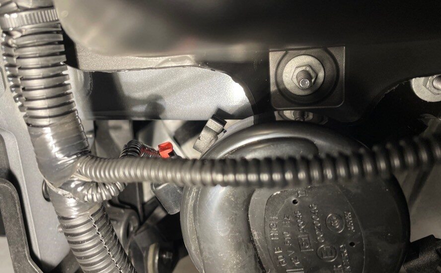 Position the low tone horn on the horn assembly bracket, and then install the nut that attaches the low tone horn to the bracket.