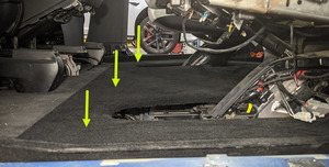 - 在助手协助下,松开将第二排中间底板连接到车辆的卡子(5 个),向上提起底板前端,然后从车上拆下底板