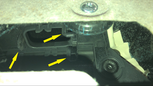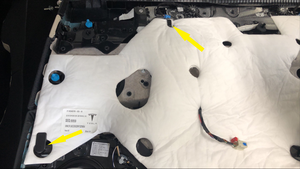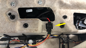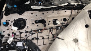 - 松开钩子(2 个),然后部分拆下左后车门噪音、振动和粗糙度 (NVH) 隔音垫,以便能够到左后车窗开关。