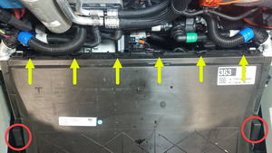 - 松开将主动进气隔栅连接到冷却风扇模块总成的锁片(12 个)和卡子(2 个),然后从车辆前部拆下进气隔栅。