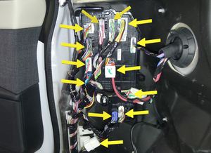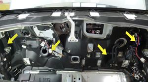 注1 个连接器,2 个固定销,6 个卡子。松开卡子,向内侧旋转立柱以够到连接器;将固定销向上从仪表板分总成中取出。