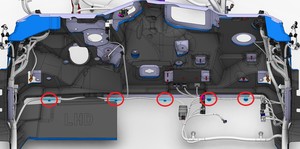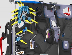 注1 个卡子,3 个连接器,6 个锁片。放置到位前勾上锁片。小心操作,以免损坏连接器/线束。连接连接器时,需支撑膝部气囊。