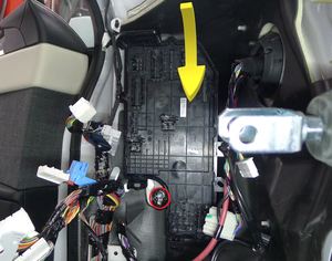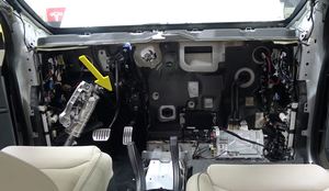 注1 个连接器,2 个固定销。向内侧旋转立柱以够到连接器;将固定销向上从仪表板分总成中取出。