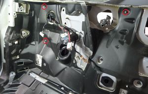 拆下左侧前备箱盖外侧铰链盖。