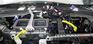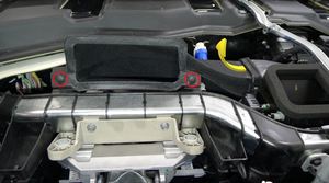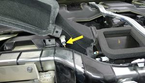 紧固 LH 减震塔盖上方的前围篦板清洗器供应软管。
