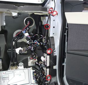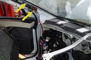 安装右侧 A 柱下饰板。