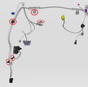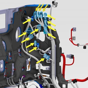 注2 个连接器,6 个锁片,1 个卡子;完全就位前,勾上锁片;小心操作,以免损坏连接器/线束;连接连接器期间,需支撑膝部气囊。