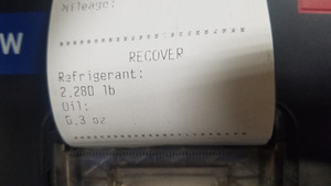 注将耦合器连接到车辆;注意制冷剂和机油的回收量,标记机油排放罐的机油液位(用胶带标记液位);顺时针旋转打开耦合器;点击 Main Menu > Recover > Verify hose connection;该过程完成后机器会发出蜂鸣声;车辆可以无人看管;记录或打印制冷剂和机油的回收量;应回收制冷剂约 2.24 磅(1.02 千克),应回收机油约 0.3 盎司(8.87 毫升);如果机油排放量增加超过 1.01 盎司(30 毫升),请参阅排油损耗图。