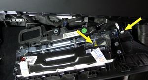 注2 个螺栓,10 mm,11.5 Nm。将中央显示器滑入仪表板支架;从右侧螺栓开始安装。